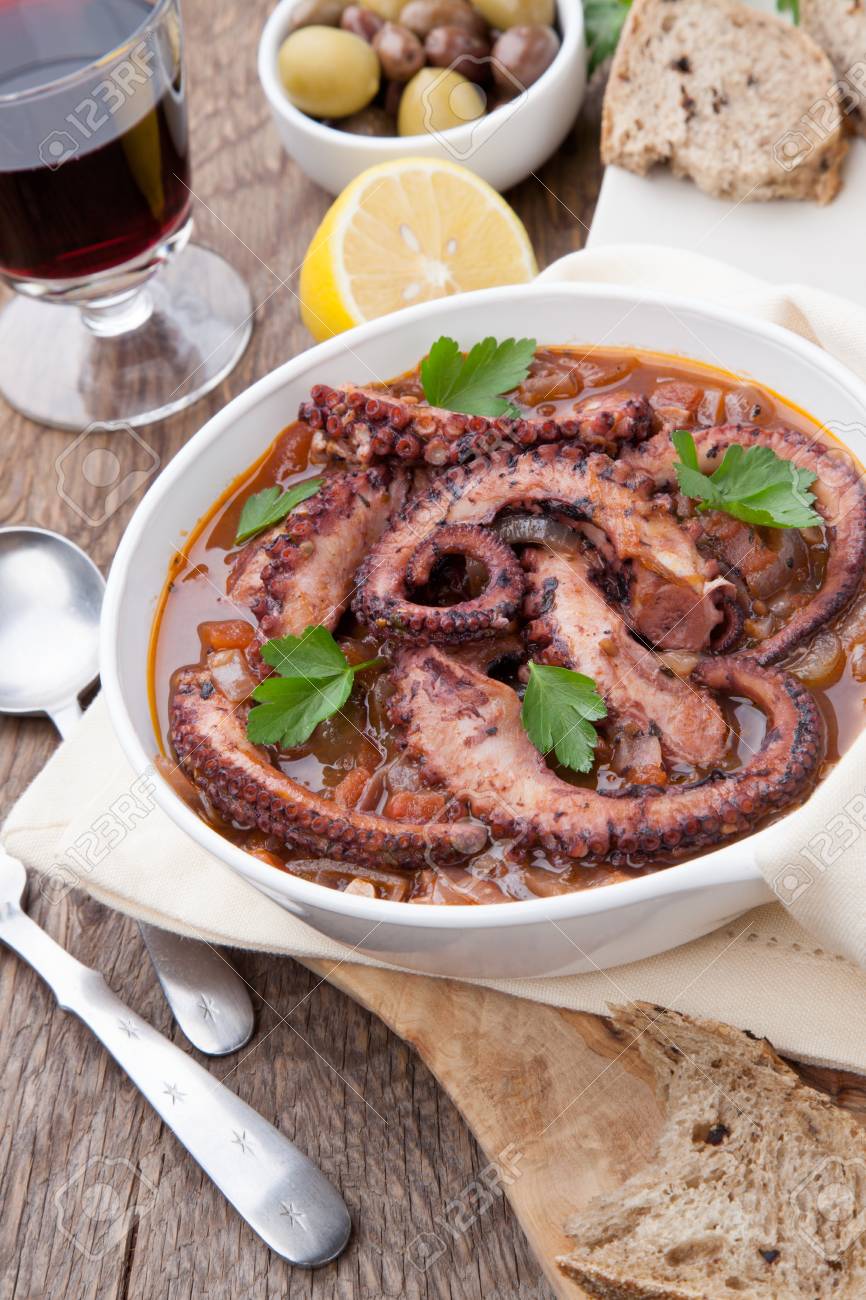 Merluza al vino tinto con patatas y aceitunas